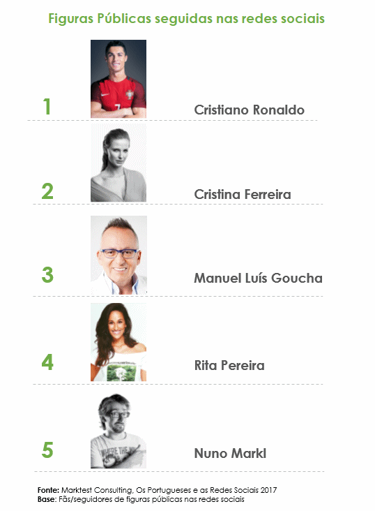 No top 5 ainda contam Cristina Ferreira e Nuno Markl, segundo um estudo da Marktest.Segundo o estudo 'Os Portugueses e as Redes Sociais' da Marktest Consulting, 46% dos utilizadores segue figuras públicas nas redes sociais e Cristiano Ronaldo é a figura pública quem tem mais seguidores.